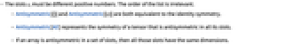 - Antisymmetric[{}] and Antisymmetric[{s}] are both equivalent to the identity symmetry.