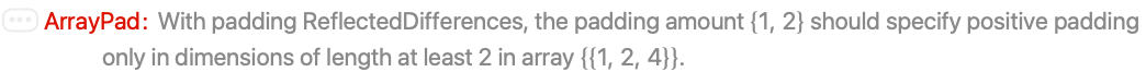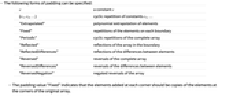 c a constant c {c1,c2,…} cyclic repetition of constants c1,… "Extrapolated" polynomial extrapolation of elements "Fixed" repetitions of the elements on each boundary "Periodic" cyclic repetitions of the complete array "Reflected" reflections of the array in the boundary "ReflectedDifferences" reflections of the differences between elements "Reversed" reversals of the complete array "ReversedDifferences" reversals of the differences between elements "ReversedNegation" negated reversals of the array - The padding value "Fixed" indicates that the elements added at each corner should be copies of the elements at the corners of the original array.