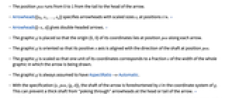 s default arrowhead with scaled size s {Automatic,pos} default arrowhead at position pos {s,pos} scaled default arrowhead at position pos {s,pos,g} arrowhead drawn as graphic g {s,pos,{g,δ}} shaft foreshortened by δ - The position pos runs from 0 to 1 from the tail to the head of the arrow.