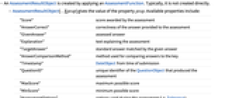 - AssessmentResultObject[…][prop] gives the value of the property prop. Available properties include: