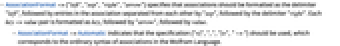 - AssociationFormat->{"left","sep","right","arrow"} specifies that associations should be formatted as the delimiter "left", followed by entries in the association separated from each other by "sep", followed by the delimiter "right". Each key->value pair is formatted as key, followed by "arrow", followed by value.
