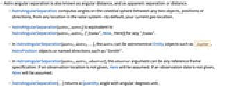 - AstroAngularSeparation[…] returns a Quantity angle with angular degrees unit.