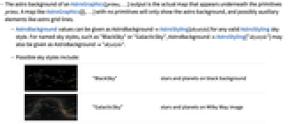 - AstroBackground values can be given as AstroBackgroundAstroStyling[skystyle] for any valid AstroStyling sky style. For named sky styles, such as "BlackSky" or "GalacticSky", AstroBackgroundAstroStyling["skystyle"] may also be given as AstroBackground"skystyle".