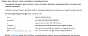 None no astro grid lines drawn Automatic astro grid lines placed automatically n approximate number of coordinate lines Quantity[…] astro grid lines placed at multiples of an angular quantity {grid1,grid2} astro grid lines specified separately for each angular direction {frame1spec1, frame2spec2,…} draw several sets of astro grid lines for respective frames - With the Automatic setting, astro grid lines are usually placed at points whose coordinates have the minimum number of digits in their decimal representation.