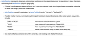 - AstroPosition[coords] is equivalent to AstroPosition[coords,"Horizon","NorthAzAlt"].