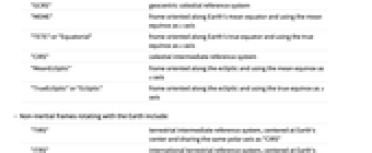 "TIRS" terrestrial intermediate reference system, centered at Earth's center and sharing the same polar axis as "CIRS" "ITRS" international terrestrial reference system, centered at Earth's center and corotating with the ellipsoidal Earth "Horizon" frame oriented along the local horizontal plane at a given geo location and centered at that location - Possible parameters for a frame of the form {"frame", "param1"val1, "param2"val2,…} include: