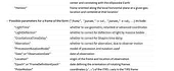 "LightTime" whether to use geometric, retarded or advanced coordinates "LightDeflection" whether to correct for deflection of light by massive bodies "GravitationalTimeDelay" whether to correct for Shapiro time delay "Aberration" whether to correct for aberration, due to observer motion "PrecessionNutationModel" model of precession and nutation used "Date" or "ObservationDate" date of observation "Location" origin of the frame and location of observation "Epoch" or "FrameDefinitionEpoch" date defining the orientation of rotating frames "PolarMotion" coordinates {x',y'} of the ITRS