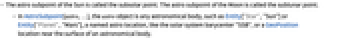 Wolfram Language. (2024). AstroSubpoint. Wolfram Language & System Documentation Center. Retrieved from https://reference.wolfram.com/language/ref/AstroSubpoint.html