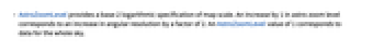 - AstroZoomLevel provides a base-2 logarithmic specification of map scale. An increase by 1 in astro zoom level corresponds to an increase in angular resolution by a factor of 2. An AstroZoomLevel value of 1 corresponds to data for the whole sky.