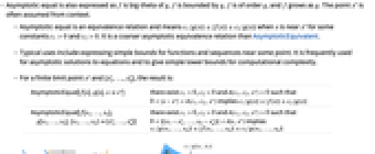. It is a coarser asymptotic equivalence relation than AsymptoticEquivalent. - Typical uses include expressing simple bounds for functions and sequences near some point. It is frequently used for asymptotic solutions to equations and to give simple lower bounds for computational complexity.