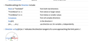 {dir1,…,dirn} use direction diri for variable xi independently - DirectionExp[ θ] at x* indicates the direction tangent of a curve approaching the limit point x*.