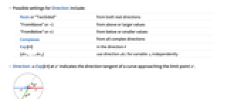 {dir1,…,dirn} use direction diri for variable xi independently - DirectionExp[ θ] at x* indicates the direction tangent of a curve approaching the limit point x*.