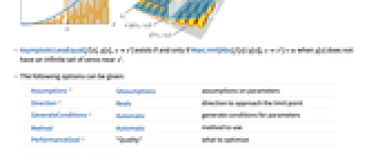 Assumptions $Assumptions assumptions on parameters Direction Reals direction to approach the limit point GenerateConditions Automatic generate conditions for parameters Method Automatic method to use PerformanceGoal "Quality" what to optimize - Possible settings for Direction include: