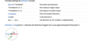 {dir1,…,dirn} use direction diri for variable xi independently - DirectionExp[ θ] at x* indicates the direction tangent of a curve approaching the limit point x*.
