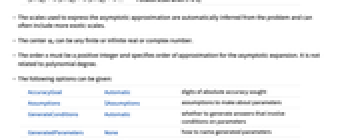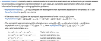 - AsymptoticProduct[f,…,ξξ0] computes the leading term in an asymptotic expansion for the product of f. Use SeriesTermGoal to specify more terms.