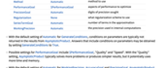 AccuracyGoal Automatic digits of absolute accuracy sought Assumptions $Assumptions assumptions to make about parameters GenerateConditions Automatic whether to generate answers that involve conditions on parameters GeneratedParameters None how to name generated parameters Method Automatic method to use PerformanceGoal $PerformanceGoal aspects of performance to optimize PrecisionGoal Automatic digits of precision sought Regularization None what regularization scheme to use SeriesTermGoal Automatic number of terms in the approximation WorkingPrecision Automatic the precision used in internal computations - With the default setting of Automatic for GenerateConditions, conditions on parameters are typically not returned in the results from AsymptoticProduct. Answers that include conditions on parameters may be obtained by setting GenerateConditions to True.
