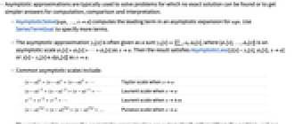 αkϕk[x], where {ϕ1[x],…,ϕn[x]} is an asymptotic scale ϕ1[x]≻ϕ2[x]≻⋯>ϕn[x] as xa. Then the result satisfies AsymptoticLess[y[x]-yn[x],ϕn[x],xa] or y[x]-yn[x]∈o[ϕn[x]] as xa. - Common asymptotic scales include: