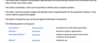 - AsymptoticSolve[eqn,…,xa] computes the leading term in an asymptotic expansion for eqn. Use SeriesTermGoal to specify more terms.