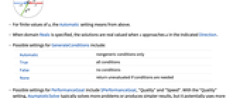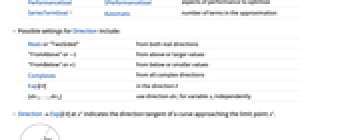 Assumptions $Assumptions assumptions to make about parameters Direction Automatic direction in which x approaches a GenerateConditions Automatic whether to generate answers that involve conditions on parameters Method Automatic method to use PerformanceGoal $PerformanceGoal aspects of performance to optimize SeriesTermGoal Automatic number of terms in the approximation - Possible settings for Direction include: