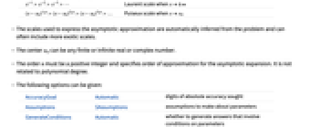 AccuracyGoal Automatic digits of absolute accuracy sought Assumptions $Assumptions assumptions to make about parameters GenerateConditions Automatic whether to generate answers that involve conditions on parameters GeneratedParameters None how to name generated parameters Method Automatic method to use PerformanceGoal $PerformanceGoal aspects of performance to optimize PrecisionGoal Automatic digits of precision sought Regularization None what regularization scheme to use SeriesTermGoal Automatic number of terms in the approximation WorkingPrecision Automatic the precision used in internal computations - Possible settings for PerformanceGoal include $PerformanceGoal, "Quality" and "Speed". With the "Quality" setting, AsymptoticSum typically solves more problems or produces simpler results, but it potentially uses more time and memory.