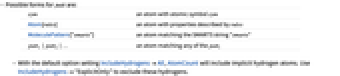 sym an atom with atomic symbol sym Atom[rules] an atom with properties described by rules MoleculePattern["smarts"] an atom matching the SMARTS string "smarts" patt1|patt2|… an atom matching any of the patti - With the default option setting IncludeHydrogensAll, AtomCount will include implicit hydrogen atoms. Use IncludeHydrogens"ExplicitOnly" to exclude these hydrogens.