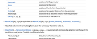 Automatic positioned at the perimeter None positioned at the center d positioned d units from the perimeter Scaled[d] positioned at a scaled distance from the perimeter Absolute[d] positioned at an absolute distance from the perimeter Offset[{dx,dy},d] positioned at an offset from d - AttachCell[obj,expr] is equivalent to AttachCell[obj,expr,{Center,Bottom},Automatic,Automatic].