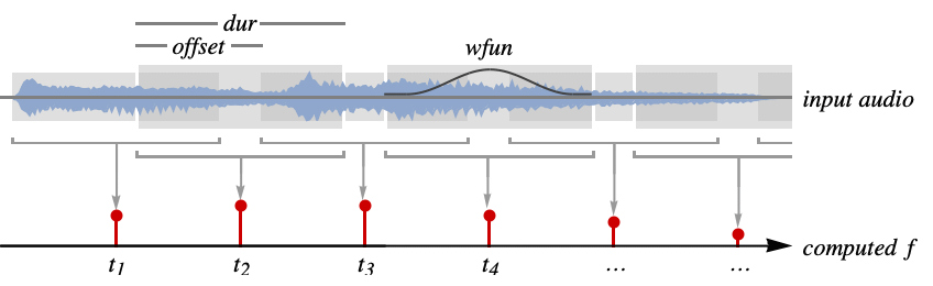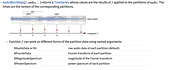 #AudioData or #1 raw audio data of each partition (default) #FourierData Fourier transform of each partition #MagnitudeSpectrum magnitude of the Fourier transform #PowerSpectrum power spectrum of each partition - Time variables dur and offset can be given as a scalar in seconds, or a time or sample Quantity object.