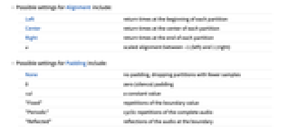 Alignment Center alignment of the time stamps with partitions FourierParameters {-1,1} Fourier parameters MetaInformation None include additional metainformation MissingDataMethod None method to use for missing values Padding Automatic padding scheme PaddingSize Automatic amount of padding ResamplingMethod "Interpolation" the method to use for resampling paths - Possible settings for Alignment include: