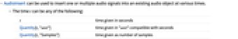 - AudioInsert can be used to insert one or multiple audio signals into an existing audio object at various times.