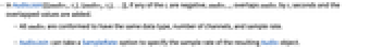 - In AudioJoin[{{audio1,t1},{audio2,t2},…}], if any of the ti are negative, audioi+1 overlaps audioi by ti seconds and the overlapped values are added.