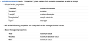 - AudioMeasurements[audio,"Properties"] gives names of all available properties as a list of strings.