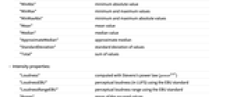 "Max" maximum value "MaxAbs" maximum absolute value "Min" minimum value "MinAbs" minimum absolute value "MinMax" minimum and maximum values "MinMaxAbs" minimum and maximum absolute values "Mean" mean value "Median" median value "ApproximateMedian" approximate median "StandardDeviation" standard deviation of values "Total" sum of values - Intensity properties: