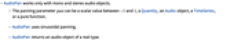 With a mono input, AudioPan duplicates the signal on the two output channels, and the pan parameter controls the left–right balance of the resulting audio object: