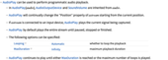 Looping Automatic whether to loop the playback MaxDuration Infinity maximum playback duration - AudioPlay continues to play until either MaxDuration is reached or the maximum number of loops is played.