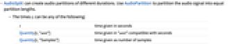 - AudioSplit can create audio partitions of different durations. Use AudioPartition to partition the audio signal into equal partition lengths.