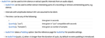 t time given in seconds Quantity[t,"unit"] time given in "unit" compatible with seconds Quantity[t,"Samples"] time given as number of samples - AudioTrim takes a Padding option. See the reference page for AudioPad for possible settings.