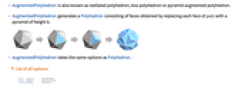 - AugmentedPolyhedron generates a Polyhedron consisting of faces obtained by replacing each face of poly with a pyramid of height h.