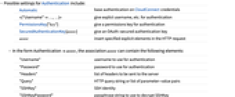 Automatic base authentication on CloudConnect credentials <|"Username"…,…|> give explict username, etc. for authentication PermissionsKey["key"] give a permissions key for authentication SecuredAuthenticationKey[assoc] give an OAuth-secured authentication key assoc insert specified explicit elements in the HTTP request - In the form Authenticationassoc, the association assoc can contain the following elements: