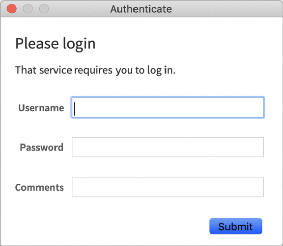 - AuthenticationDialog by default puts up a dialog in the middle of the main display screen. Explicit settings for WindowMargins override this.