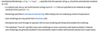 - AutoOperatorRenderings{"op1""rend1",…} specifies that the operator string opi should be automatically rendered as rendi.