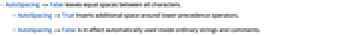 - AutoSpacing->False is in effect automatically used inside ordinary strings and comments.