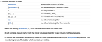 Automatic sequentially run each variable {Automatic,t} run sequentially for t seconds in total i run only variable i {i,j,…} run variable i, then j, ... {{i,ti},…} run variable i for t seconds, etc. All run all variables together {All,t} run all variables together for t seconds - With the setting {Automatic,t}, each variable is allocated the same time.
