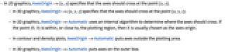 - In 2D graphics, AxesOrigin->{x,y} specifies that the axes should cross at the point {x,y}.