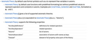 - AxiomaticTheory[theory] is equivalent to AxiomaticTheory[theory,"Axioms"].