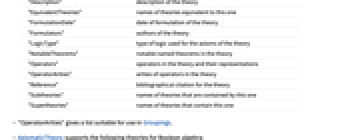 "AncillaryDefinitions" definitions for related operators "AncillaryOperators" related operators "Axioms" list of axioms "AxiomsAssociation" association of axioms with names as keys "Dataset" dataset of all property value pairs of the theory "Description" description of the theory "EquivalentTheories" names of theories equivalent to this one "FormulationDate" date of formulation of the theory "Formulators" authors of the theory "LogicType" type of logic used for the axioms of the theory "NotableTheorems" notable named theorems in the theory "Operators" operators in the theory and their representations "OperatorArities" arities of operators in the theory "Reference" bibliographical citation for the theory "Subtheories" names of theories that are contained by this one "Supertheories" names of theories that contain this one - "OperatorArities" gives a list suitable for use in Groupings.