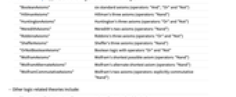 "BooleanAxioms" six standard axioms (operators: "And", "Or" and "Not") "HillmanAxioms" Hillman's three axioms (operators: "Nand") "HuntingtonAxioms" Huntington's three axioms (operators: "Or" and "Not") "MeredithAxioms" Meredith's two axioms (operators: "Nand") "RobbinsAxioms" Robbins's three axioms (operators: "Or" and "Not") "ShefferAxioms" Sheffer's three axioms (operators: "Nand") "OrNotBooleanAxioms" Boolean logic with operators "Or" and "Not" "WolframAxioms" Wolfram's shortest possible axiom (operators: "Nand") "WolframAlternateAxioms" Wolfram's alternate shortest axiom (operators: "Nand") "WolframCommutativeAxioms" Wolfram's two axioms (operators: explicitly commutative "Nand") - Other logic-related theories include: