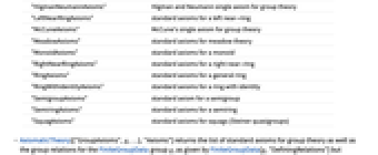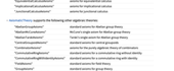 "AbelianGroupAxioms" standard axioms for Abelian group theory "AbelianMcCuneAxioms" McCune's single axiom for Abelian group theory "AbelianTarskiAxioms" Tarski's single axiom for Abelian group theory "CentralGroupoidAxioms" standard axioms for central groupoids "CombinatorAxioms" axioms for the purely algebraic theory of combinators "CommutativeRingAxioms" standard axioms for a commutative ring without identity "CommutativeRingWithIdentityAxioms" standard axioms for a commutative ring with identity "FieldAxioms" standard axioms for field theory "GroupAxioms" standard axioms for group theory "HigmanNeumannAxioms" Higman and Neumann single axiom for group theory "LeftNearRingAxioms" standard axioms for a left near-ring "McCuneAxioms" McCune's single axiom for group theory "MeadowAxioms" standard axioms for meadow theory "MonoidAxioms" standard axioms for a monoid "RightNearRingAxioms" standard axioms for a right near-ring "RingAxioms" standard axioms for a general ring "RingWithIdentityAxioms" standard axioms for a ring with identity "SemigroupAxioms" standard axiom for a semigroup "SemiringAxioms" standard axioms for a semiring "SquagAxioms" standard axioms for squags (Steiner quasigroups) - AxiomaticTheory[{"GroupAxioms",g,…},"Axioms"] returns the list of standard axioms for group theory as well as the group relations for the FiniteGroupData group g, as given by FiniteGroupData[g,"DefiningRelations"] but expressed using the operators and constants used in the axioms.