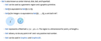 - Ball[n] for integer n is equivalent to Ball[{0,…,0}], a unit ball in