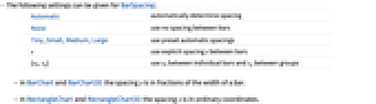 Automatic automatically determine spacing None use no spacing between bars Tiny,Small,Medium,Large use preset automatic spacings s use explicit spacing s between bars {sb,sg} use sb between individual bars and sg between groups - In BarChart and BarChart3D the spacing s is in fractions of the width of a bar.
