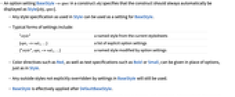 - An option setting BaseStyle->spec in a construct obj specifies that the construct should always automatically be displayed as Style[obj,spec].